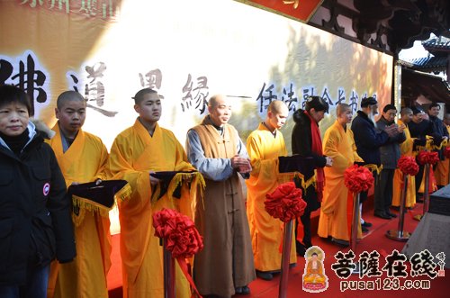 10点整,寒山寺法堂前,秋爽大和尚主持了佛道墨缘--任法融道长书法展剪彩仪式。