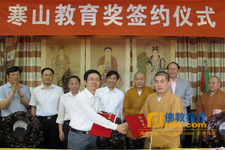 佛教在线江苏讯 2010年5月27日下午3点,江苏省苏州市寒山寺在苏州科技学院设立“寒山教育奖”签约仪式在该寺丈室楼举行。寒山寺决定于2010年至2013年四年内,每年出资25万,奖励苏州科技学院家庭经济困难且品学兼优的本科生40名、研究生10名,优秀青年教师15名。