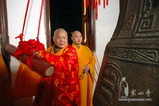23:30,寒山寺方丈秋爽大和尚登台为全体来宾祈福;23:42,秋爽方丈开始敲响108下除夕钟声。随着第一下钟声响起,人群立刻安静下来,人们不由朝向钟楼,凝神默祷,钟声清朗,余韵悠远,将人们的祝福带往远方的亲友,带到每个人的内心深处。