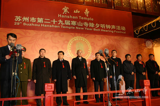 昨晚,第29届寒山寺除夕听钟声活动在欢声笑语中如期而至,江苏省委常委、苏州市委书记王荣,市委副书记、市长阎立,市领导周福元、冯瑞渡、周向群、周伟强、王少东、肖汉涛,寒山寺听钟声活动日方发起人、日本大阪府日中友好协会副会长、苏州市荣誉市民藤尾昭夫妇等参加了听钟声系列活动,共祝全市人民和海内外嘉宾生活美满、万事如意。