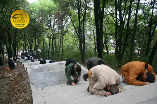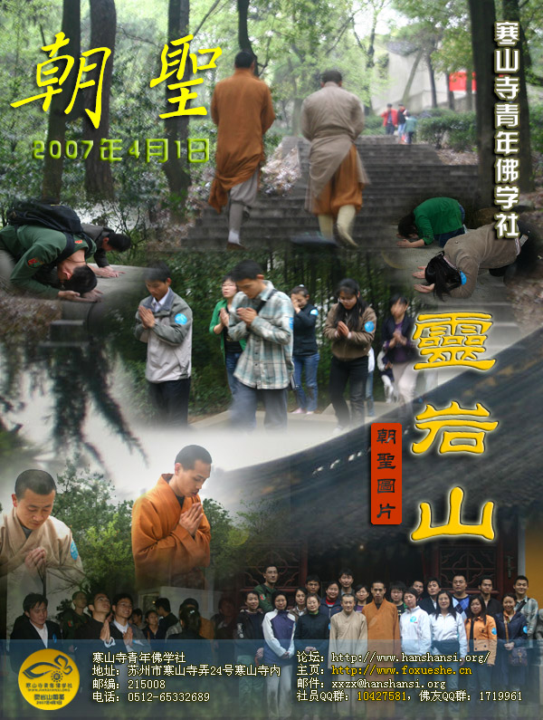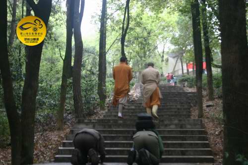 上午九点四十分寒山寺青年佛学社共修团抵达灵岩山脚,社长宏奎师带领大众开始礼拜上山,途中下起小雨,社员们依然至诚恭敬地三步一拜,直至印祖塔院。