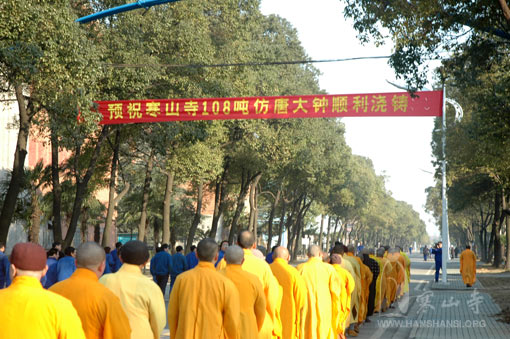 2007年元月8日上午,寒山寺于湖北省武汉重工铸锻有限责任公司隆重举行108吨仿唐大钟浇铸洒净仪式。