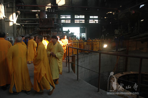 武汉重工铸锻有限责任公司曾先后设计铸造过黄鹤楼千年吉祥钟、河南汝山108吨大钟、九华山万佛铜塔、华西村145吨青铜洪钟等许多享誉国内外的大型有色艺术铸造产品,有着雄厚的专业技术实力和良好的社会信誉。秋爽法师对武汉重工铸锻有限责任公司 “以佛心对待铸钟、以精心指挥铸钟、以细心管理铸钟、以诚心贯彻铸钟、以全心服务铸钟”的精神深表敬佩和感谢。