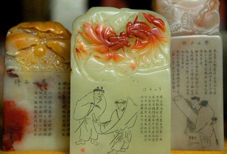 12月21日拍摄的“寒山诗刻”微雕石章。苏州微雕工艺家潘裕果经过8个多月的精雕细刻,将《寒山子诗集》中收录的388首诗作以诗配画形式,分别刻录在216块寿山石章上,并即将在“寒山古钟博物馆”陈列展出。
