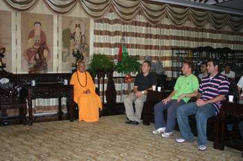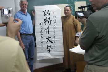 本站讯: 2005年10月13日下午一时许, 美国洛特丹大学商学院一行30余人访问寒山寺.寒山寺秋爽大和尚亲切会见了访问团一行. 秋爽大和尚为访问团介绍了寒山寺的历史沿革及寺院最近的法务活动.访问团对寒山寺的钟文化非常感兴趣,双方进行佛学座谈,共同探讨中西方文化的差异以及佛教在美国的发展情况. 下午五时,寒山书院为访问团安排了精彩的武术表演和佛教书法交流.双方互赠了礼品,寒山寺常住向访问团赠送了最新出版的季刊<<寒山寺>>及寒山钟声纪念品. 晚上七时,访问团一行品尝了寒山寺素斋馆的素斋,带着喜悦返回下榻的宾馆.