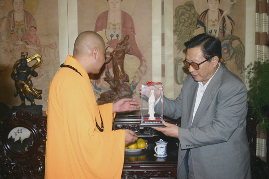 10月3日国务院副秘书长华建敏一行,在苏州宗教局长王科军等领导的陪同下参观寒山寺,寒山寺秋爽大和尚热情接待并赠送礼品。