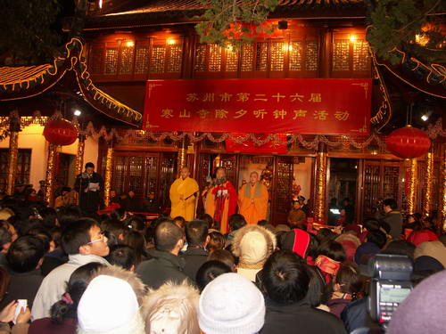 据了解,寒山寺第27届听钟声活动,将分二步:一是在苏州人民大会堂欣赏佛教梵呗音乐会;二是将此次听钟声活动与新年烧头香活动有序地衔接起来,寒山寺将制作精美的香花券。另外寒山寺还将备制《寒山寺》杂志2005年全年4期合订本、体现寒山寺景点特色和寒山寺慈善中心重要活动的佛教挂历、以及寒山拾得像挂件、胸章等系列精美礼品赠送来宾。活动期间,寒山寺还将展出收集的历代大小梵钟110口。