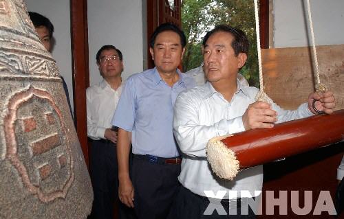 9月16日,亲民党主席宋楚瑜在寒山寺撞响大钟。当日,亲民党主席宋楚瑜一行到江苏苏州参观访问。新华社记者韩瑜庆摄